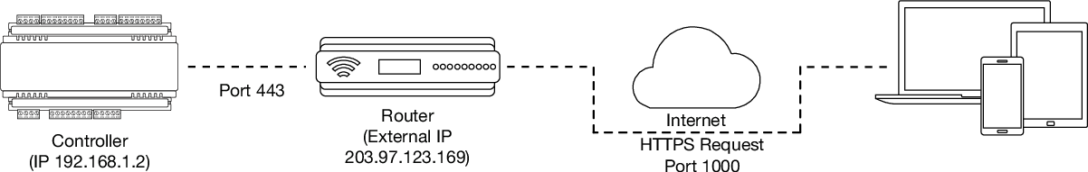 After you have installed a certificate and established an HTTPS connection to the controller, you may wish to continue accessing the controller over the internet. To achieve this, the controller must be accessible via its HTTPS port. The default HTTPS port is internal port 443, but this can be changed if necessary in the System Settings (available once Use HTTPS is enabled).
